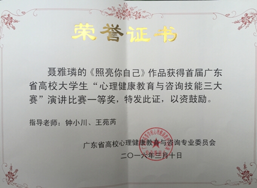 近日,首届广东省高校大学生心理健康教育与咨询技能大赛获奖结果揭晓。中文系聂雅璘同学荣获“心理健康教育主题演讲赛”一等奖、外语系张映辉同学荣获二等奖。