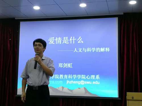 讲座中,郑剑虹教授从文学、哲学、神经科学和心理学几个方面对爱情进行了深入浅出地诠释,尤其着重介绍了心理学家的解释,谈到了古德、马斯洛对爱情的定义,弗洛依德、霍妮、罗洛梅对爱情的论述,还介绍了社会心理学家对爱情的研究,以及进化论心理学家对男女择偶偏好的看法。